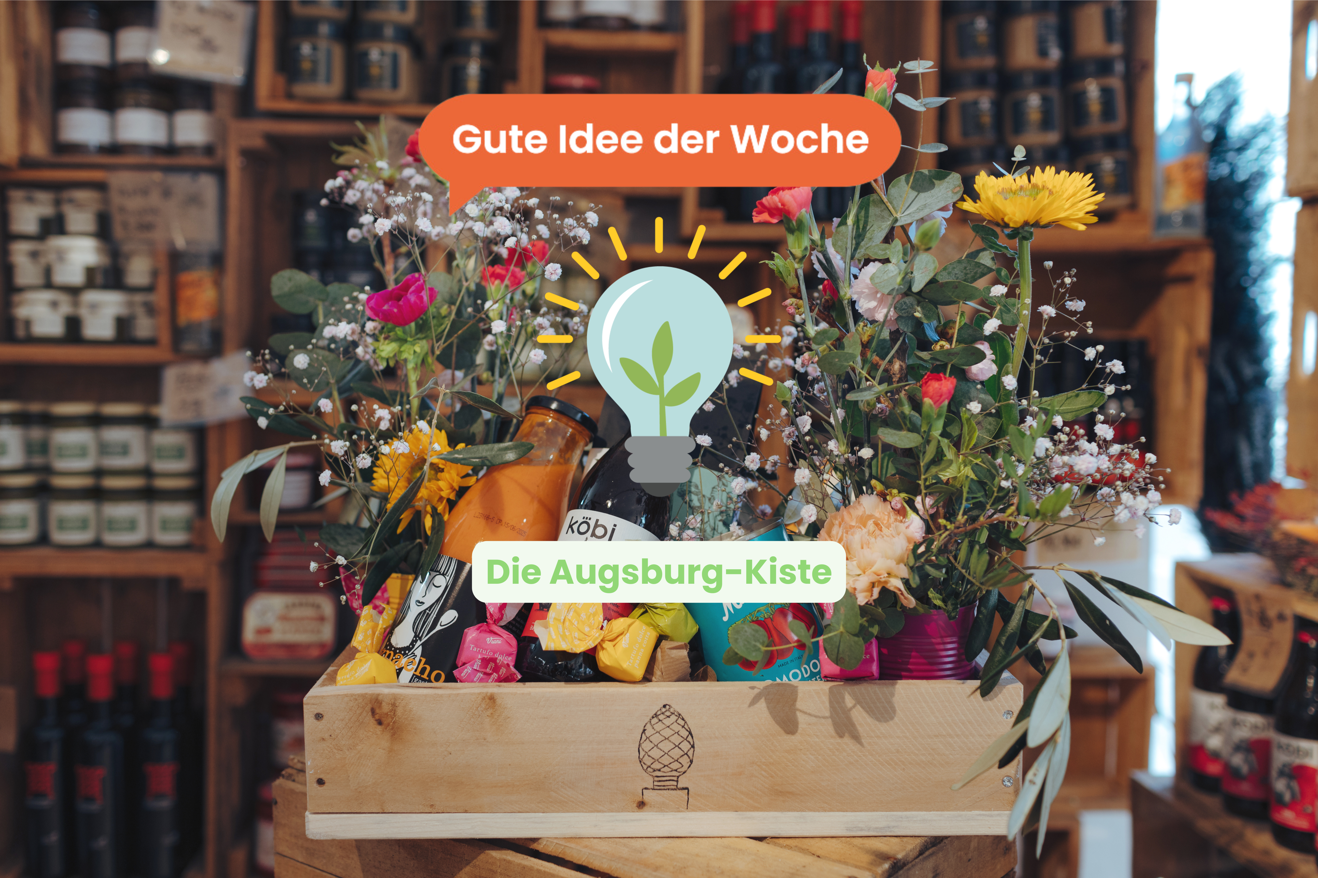 Die "Augsburg-Kiste" ist eine Idee der Blumenmanufaktur Augsburg. Sie enthält neben Blumen eine Sammlung regionaler Feinkostprodukte in einer handgemachten Holzkiste. Jede Kiste wird individuell mit Chutneys, Craft-Bieren, Oliven und Bioprodukten von kleinen, lokalen Manufakturen nach Kundenwünschen zusammengestellt.