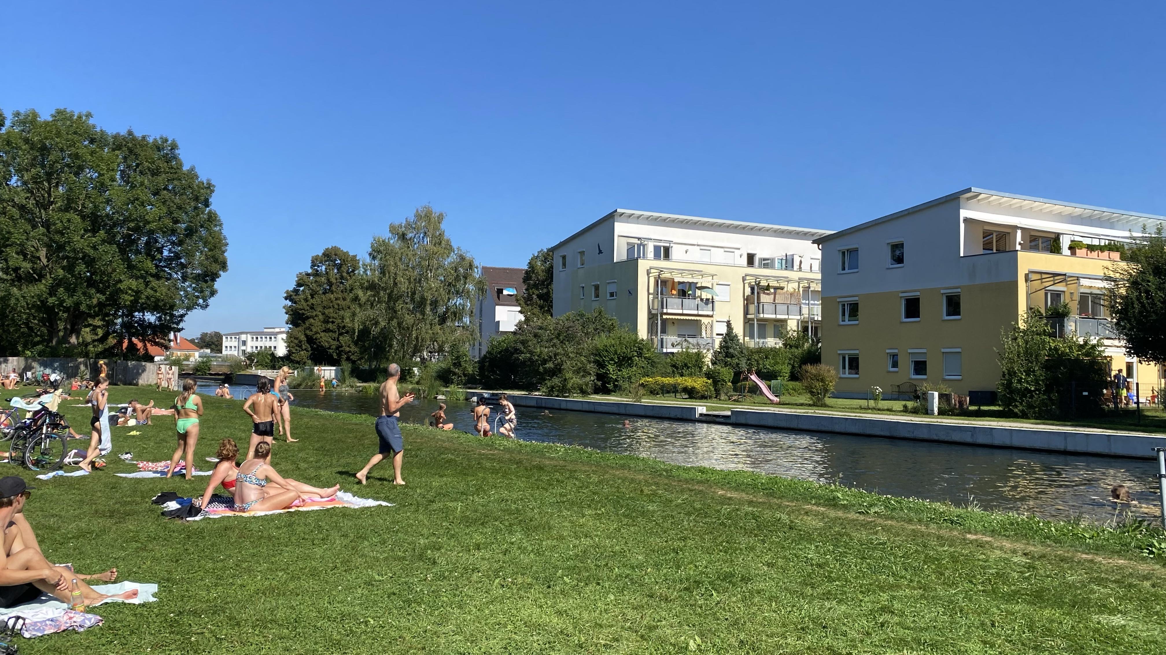 Der Badebereich am Schäfflerbach beginnt an der Friedberger Straße hinter dem Textilmuseum. Die Strecke ist kurz, die Strömung sanft, es gibt eine kleine Liegewiese.