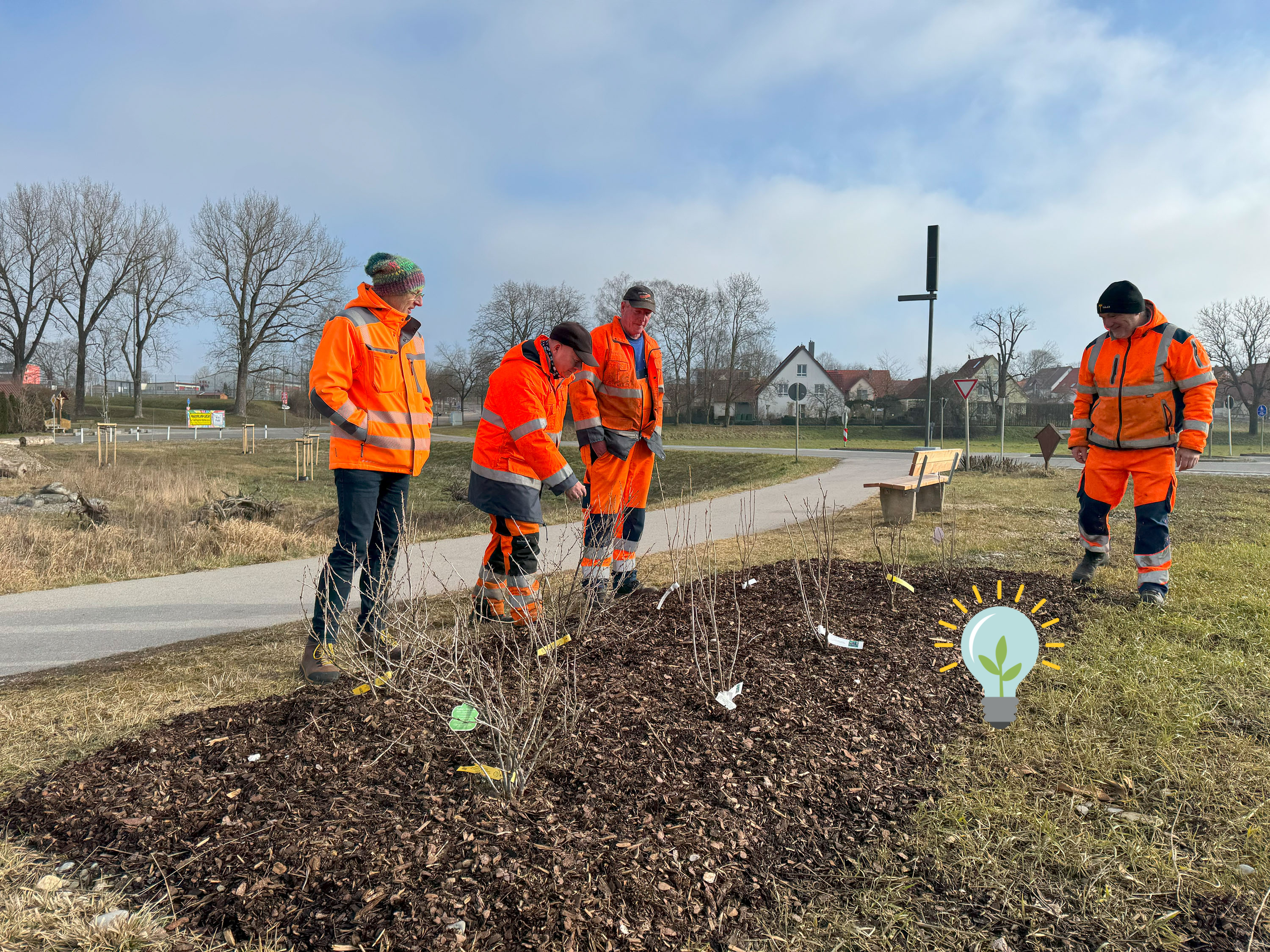 Hirblingen begrüßt künftig seine Bewohner*innen und Besucher*innen nicht nur mit einer neuen Straßenführung, sondern auch mit einer langen Naschhecke aus Stachelbeeren, Himbeeren und Johannisbeeren in verschiedenen Sorten. In den kommenden Jahren könnt ihr dann dort gern die Früchte für den Eigenbedarf ernten. Um die Wurzeln der neuen Büsche und Bäume zu schützen, wurde keine Blumenwiese angelegt. Eine aufgestellte Bank lädt zudem zum Ausruhen ein.