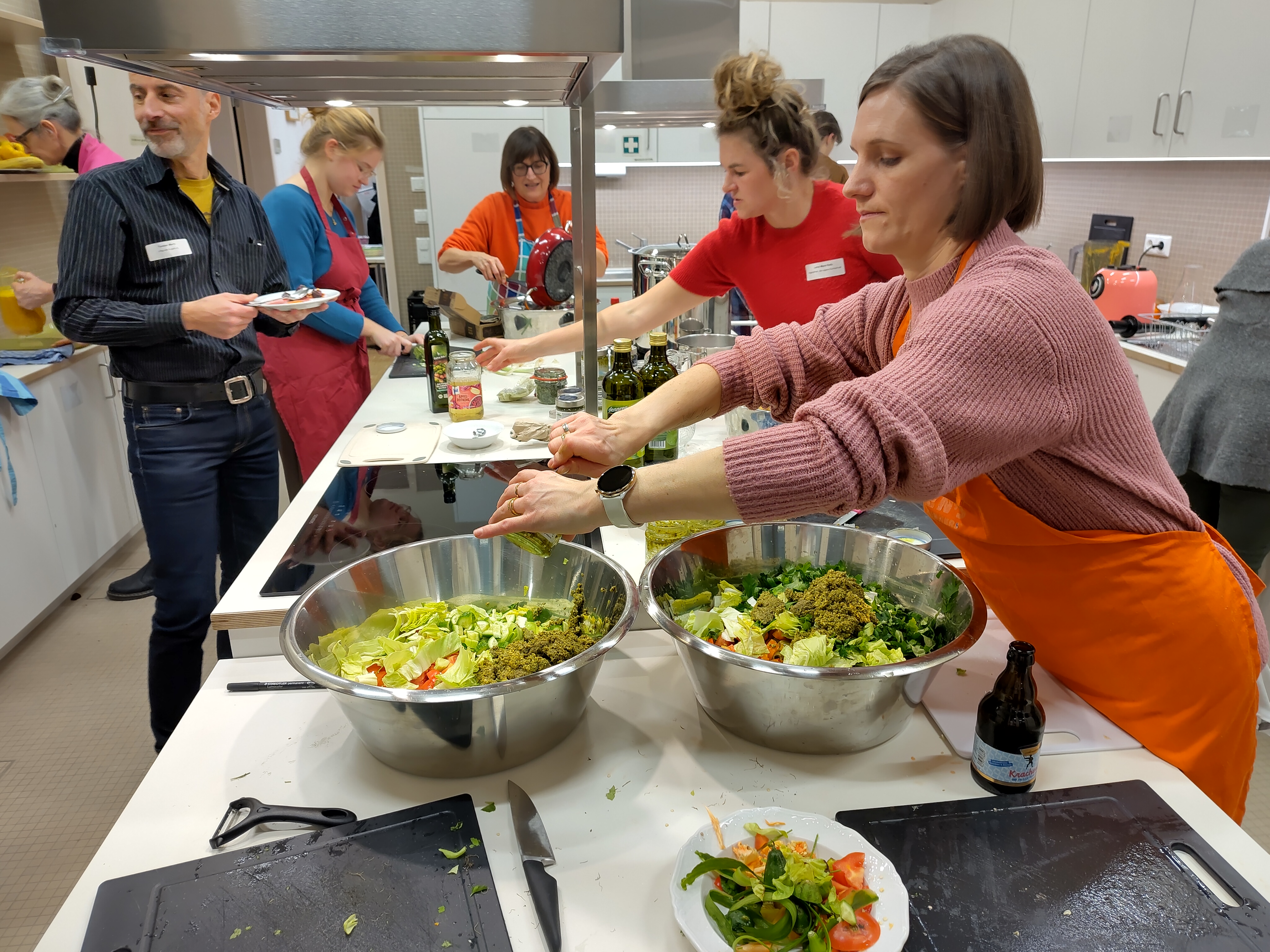Das kulinarische Highlight des Abends war das reichhaltige Buffet, das jeden Geschmack traf. Von Ingwer-Kurkuma-Shots über Brotsalat und Ofengemüse mit Quitten bis hin zu Karotten-Rohkost, Rote-Bete-Salat und Tomatensalat – alles fand begeisterte Abnehmer. Die grüne Suppe, mit extra viel Gemüse zubereitet, war ein voller Erfolg, ebenso wie die Willkommens-Häppchen aus Oliven, Cremes und Brot.